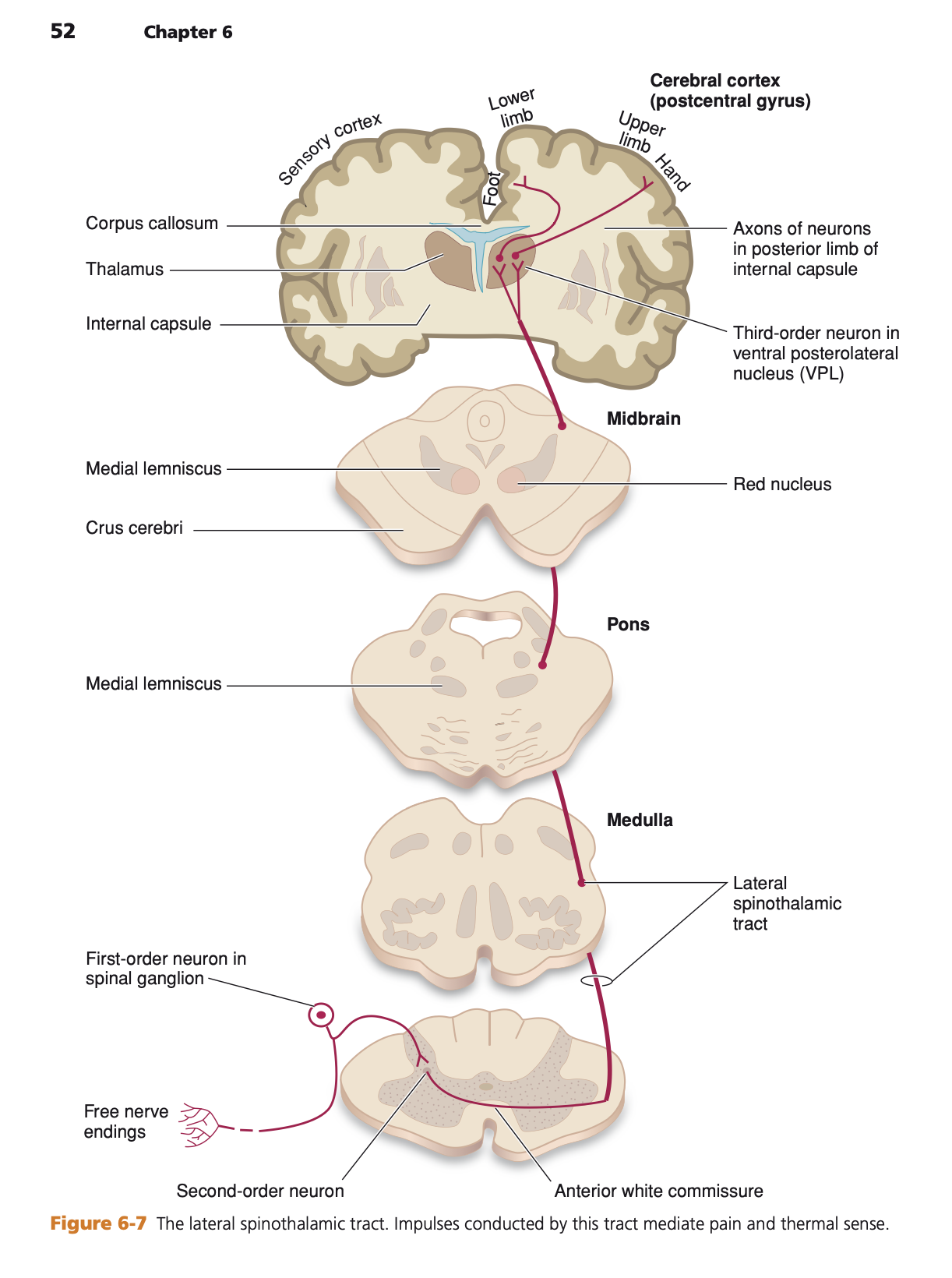 | Spinothalamic (LSTT) | Pain, Temperature. | Spinal Cord (Anterior White Commissure, 1-2 levels above entry). |